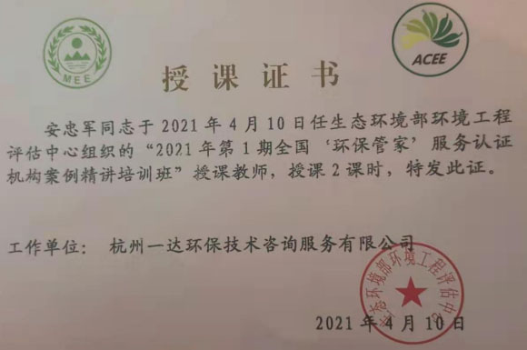 2021年4月8日至10日,由生态环境部评估中心组织在广州进行了2021年第1期全国“环保管家“服务认证机构案例精讲培训,我司“永康市环境医院环保管家服务”成功入选生态环境部环评分会一级环保管家服务认证机构精选案例,特邀公司副总安忠军高级工程师为大家授课。